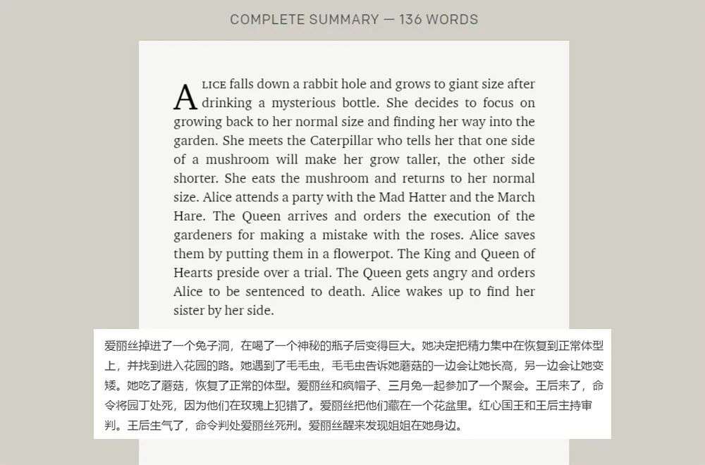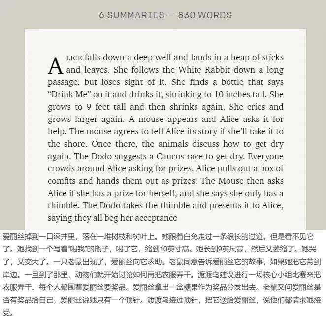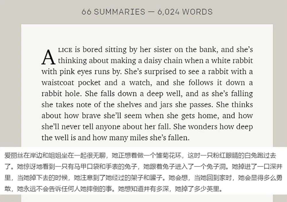 以很多人看过的《爱丽丝梦游仙境》为例,这本书共十二个章节,近26,449词。在AI更改后变成以下136词英文摘要,也就是差不多一条微博文字的长度,大家感受一下: