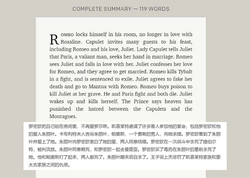 看完童话故事,再看看更有难度的著名剧作家莎士比亚的名著《罗密欧与朱丽叶》,“读”完这本书后,AI写下119词摘要: