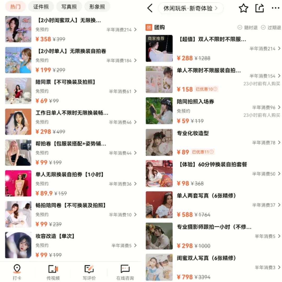 在这个基础上,顾客可选择加时服务,或者预约化妆师和摄影师跟拍,同时价格也相应上涨。比如额外购买89元的妆造、298元的专业摄影套餐等。