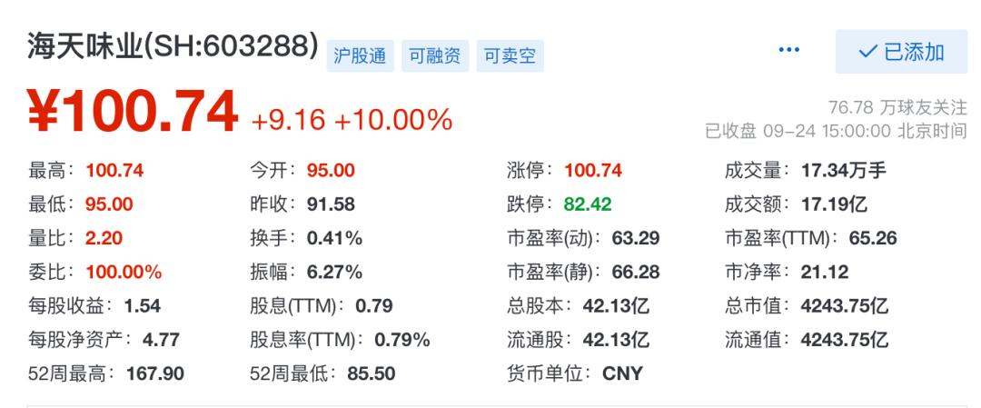 受该消息影响,昨日,海天味业盘中一度涨停,带动A股食品加工板块集体走强。截至目前,品渥食品涨20%涨停,仲景食品涨超10%,千禾味业、中炬高新涨10%涨停,海天味业逼近涨停,味知香、安井食品等跟涨。
