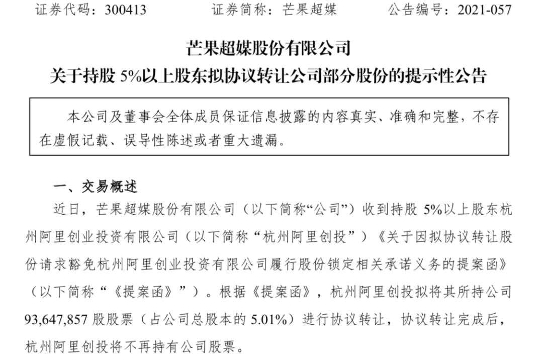 23日晚,芒果超媒突发公告引发热议。公告称,“公司第三大股东”阿里创投拟将其所持芒果超媒9364.79万股份(占公司总股本 5.01%)对外协议转让,转让完成后,阿里创投将不再持有任何公司股票。