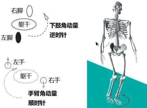 右脚前迈时,下肢存在逆时针角动量,摆臂提供顺时针角动量将其基本抵消 | 参考文献[4]