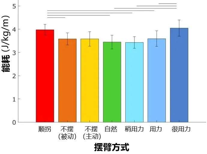 一项研究对比了7种不同摆臂方式下走路的能量消耗,其中包括自然摆臂、大爷的不摆臂、大妈的用力甩以及顺拐(同手同脚)[2]。
