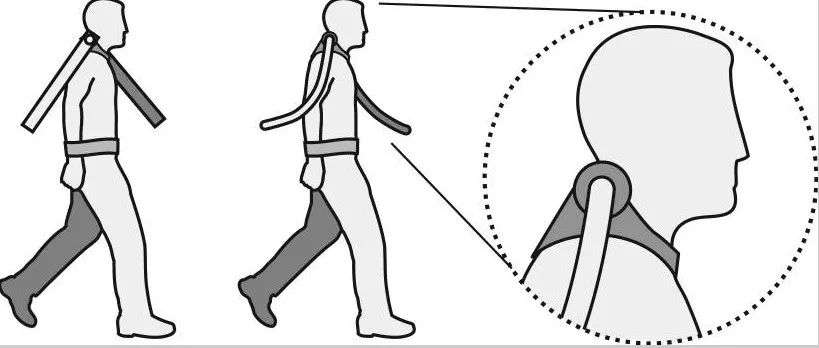 近期一项研究将人手臂绑在身上,肩上连接可以自由摆动的“假臂”,发现“假臂”也会随着迈腿前后摆动(左图为摆动的硬木棍,中图为软绳子,右图示肩连接处)| 参考文献[5]