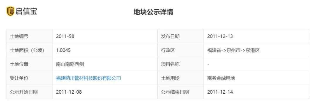 启信宝信息显示,该地块面积约1公顷,位于泉州市泉港区,用途为商务金融用地。在纳川股份随后披露的年报里,该地块一直就存在于“其他非流动资产-预付购买土地款”科目中,直至2017年。