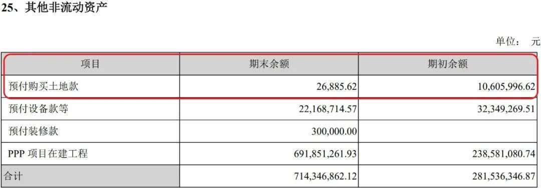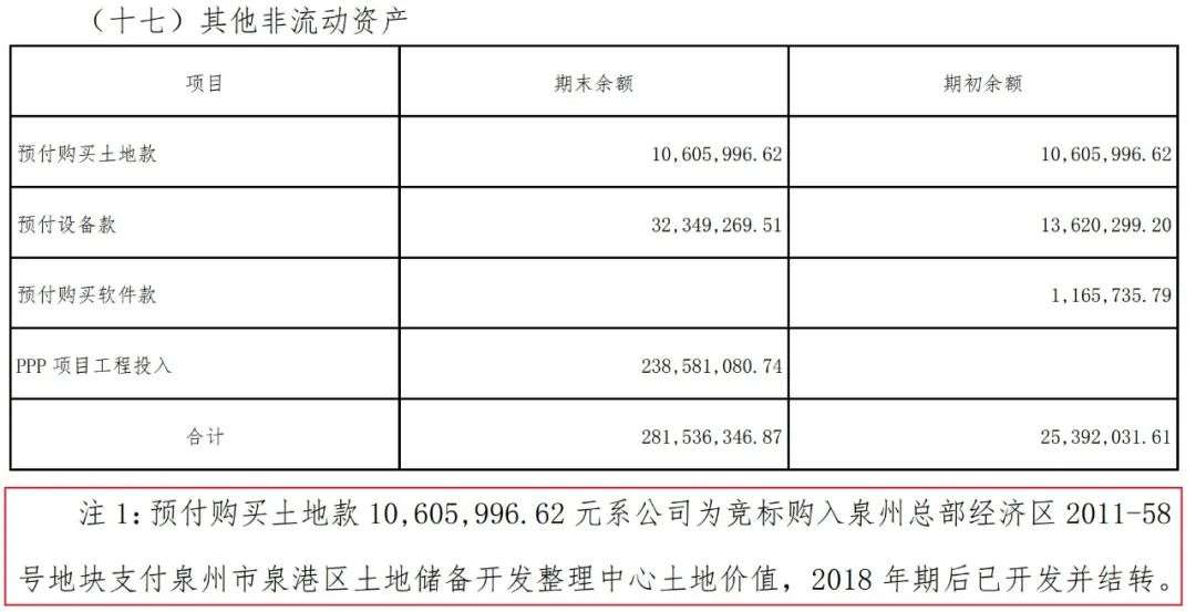 据纳川股份2018年年报,预付购买土地款余额仅剩约2.7万元。纳川股份在附注解释称,公司为竞标购入泉州总部经济区2011-58号地块支付泉州市泉港区土地储备开发整理中心土地价值共计1060.60万元,预付账款余2.69万元。