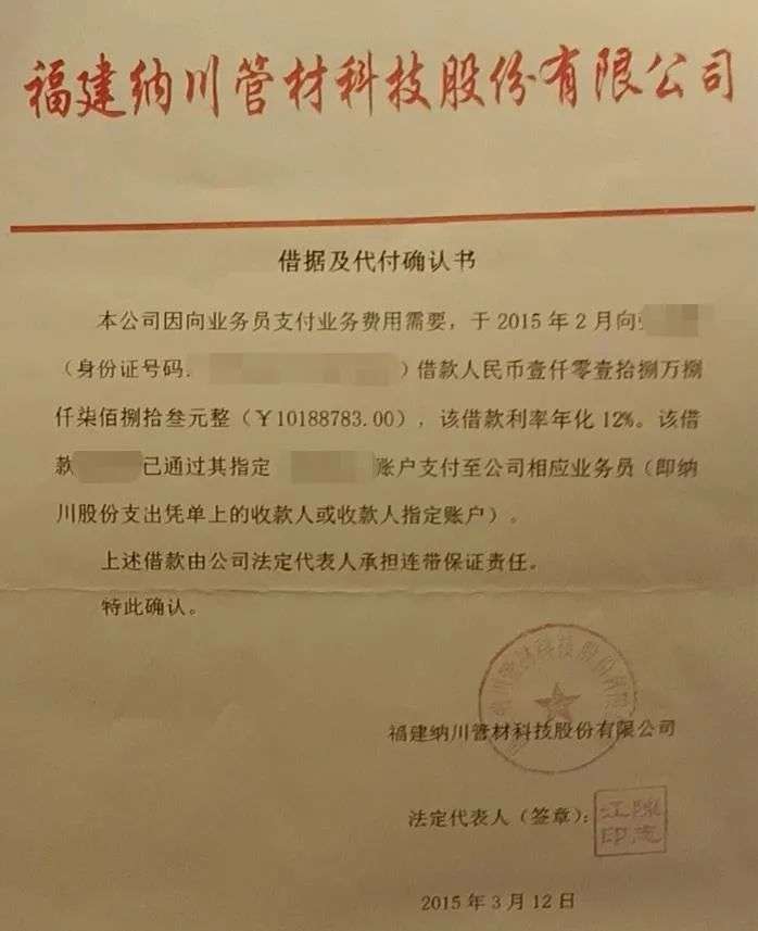 纳川股份向该知情人士出具的《借据及代付确认书》图片来源:知情人士提供