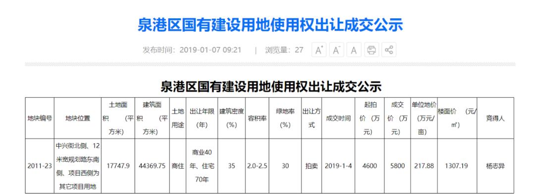 此外,2019年1月,泉港区拍卖的2011-23号地块的楼面价为1307.19元/平方米,该地块与2011-58号地块直线距离约2千米。以此1307.19元/平方米价格和2011-58号地块的预售面积29527.25平方米大致估算,2011-58号地块的价值约为3860万元。而2011-58号地块毗邻一大型公园,从安居客上公开的房价数据来看,2011-58号地块周边房价还要高于2011-23号地块周边房价。