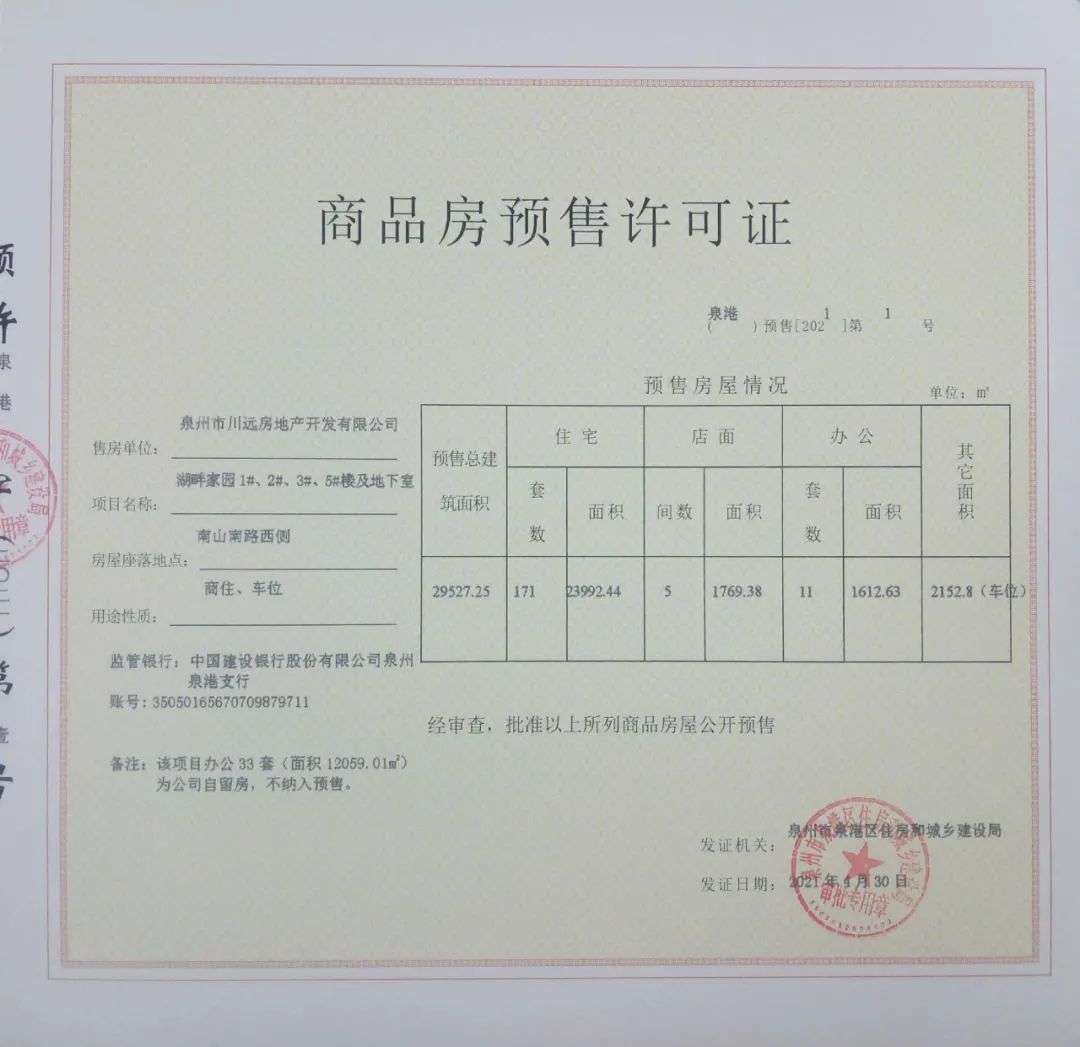 工作人员介绍称,剩余的三号楼三楼的一套住宅单价约4400元/平方米。按照泉州川远的预售证信息,住宅预售面积为23992.44平方米,店面和办公分别为1769.38平方米和1612.63平方米,车位2152.8平方米。以4400元/平方米的价格计算,住宅的价值约1.06亿元。
