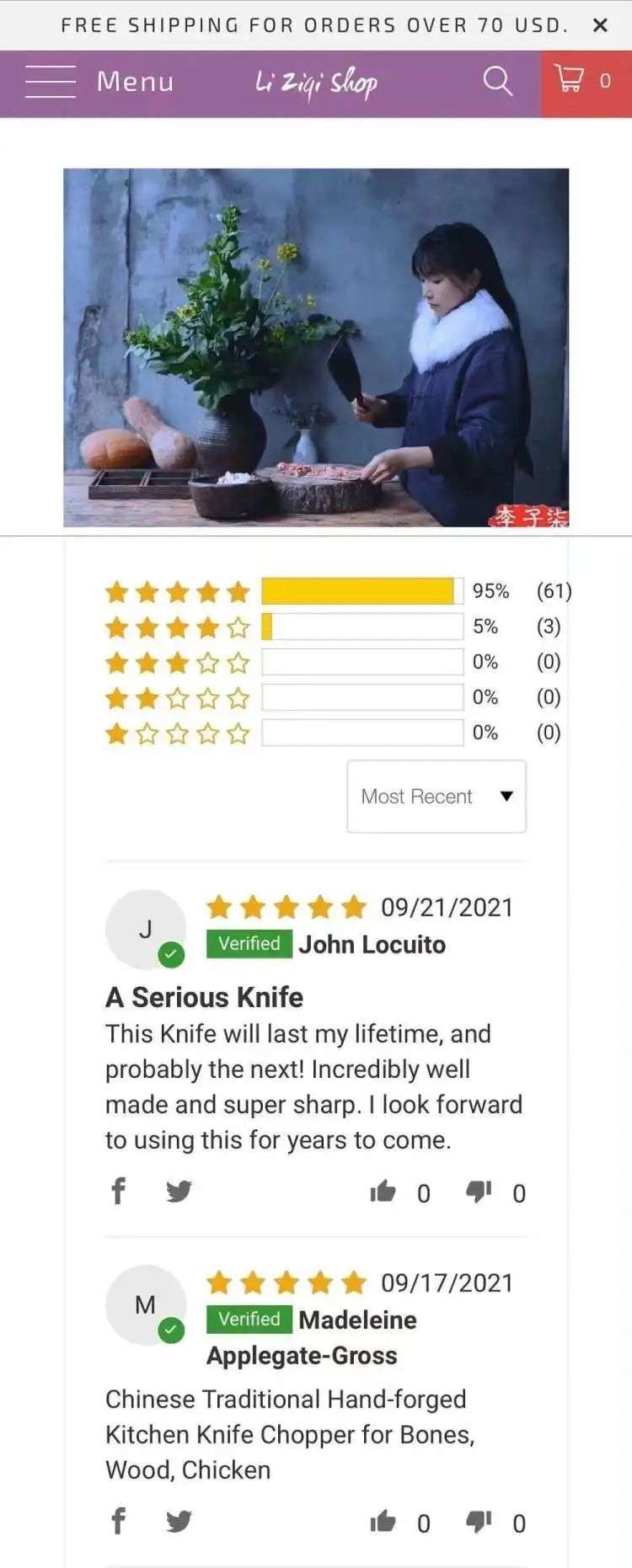 依托于海外平台的粉丝流量,李子柒IP还搭建起了跨境电商独立站,其平台上的商品不同于天猫品牌店以美食为主,而是以视频为周边的中国传统服装配饰、厨具、手工艺品等。其中海外买家好评最多的,是李子柒视频中经常使用的一把古风厨刀,很多消费者留言表示使用体验很不错,但舍不得用,买来主要是收藏。