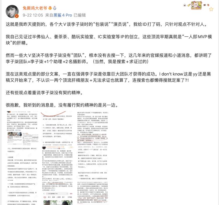 传闻愈加甚嚣尘上,9月中旬甚至有网友称李亚鹏近来频频更新的国风短视频镜头语言非常“李子柒”,疑似挖走了后者的拍摄团队,这则消息也再度上了热搜。直到李亚鹏和李子柒助理先后发文公开否认,此事才告一段落。9月23日,消失了两个多月的李子柒以“四川农耕文化形象大使”的身份,出现在当地农民丰收节现场,但也并未对这段时间的遭遇做出任何解释。