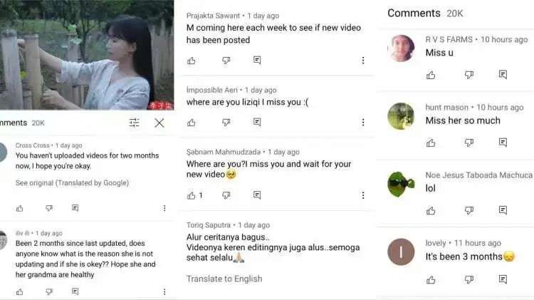 在众多留言中,除了对视频内容的赞叹惊艳和好奇提问外,不乏外国粉丝们对李子柒的花式表白与催更,但随着断更时间的延长,外国网友们也嗅到了事情的不寻常,担忧地询问近况的人越来越多。其中,有略知情的中国网友评论称“可能再也等不到李子柒的新视频了,因为她与背后的资本闹翻了”。