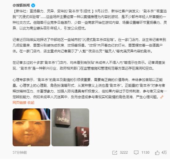 另一条是同样在9月22日,新华社客户端发文,指出宣扬暴利、灵异等猎奇元素的变味“剧本杀”引人担忧。