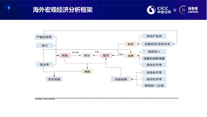 我们都知道产出决定于需求和供给这两者的变化,结合库存变化则会影响通胀。所以我们推演影响需求和供给的变量,就可以对于整体增长的环境,以及通胀的变化有一个大致的判断。我举个简单的例子,疫情以来大家经常谈论一个词,叫做供需错配。为什么需求和供给会有一个明显的错配呢?需求来自于哪儿?它有没有后续的韧性?供给为什么又会受限?