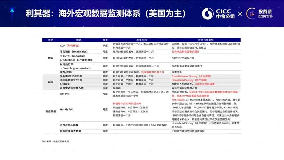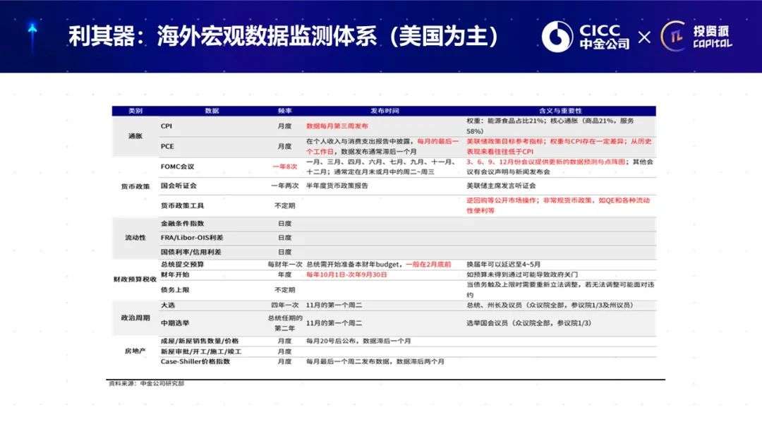 第一部分叫做利其器,利其器的意思是说在研究之前,我们至少需要知道我们的重点关注数据。这一部分内容是过去这么多年研究经验中我们所总结下来的重要指标。当然这些指标不一定很完备,并且每个人分析的习惯和视角不一样,所以不一定是普适性所有人。但站在我们的研究视角,这些海外指标则相对比较重要。因为很多时候在数据太多的情况下,大家往往会被淹没在数据里。