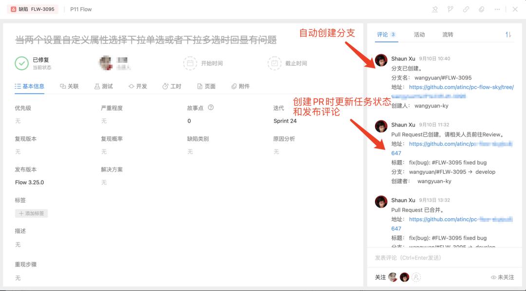 这是场景1的延续场景,当开发人员完成开发,向主分支提交 PR/MR 时,这个源分支对应的“任务”(当然也可以是PR/MR标题中包含的相关“任务”)的状态会自动变更为 “Code Review”,同时系统会自动在“任务”中增加一条评论,告知 PR/MR 的主要信息,甚至可以@相关的开发人员来进行 Code Review。