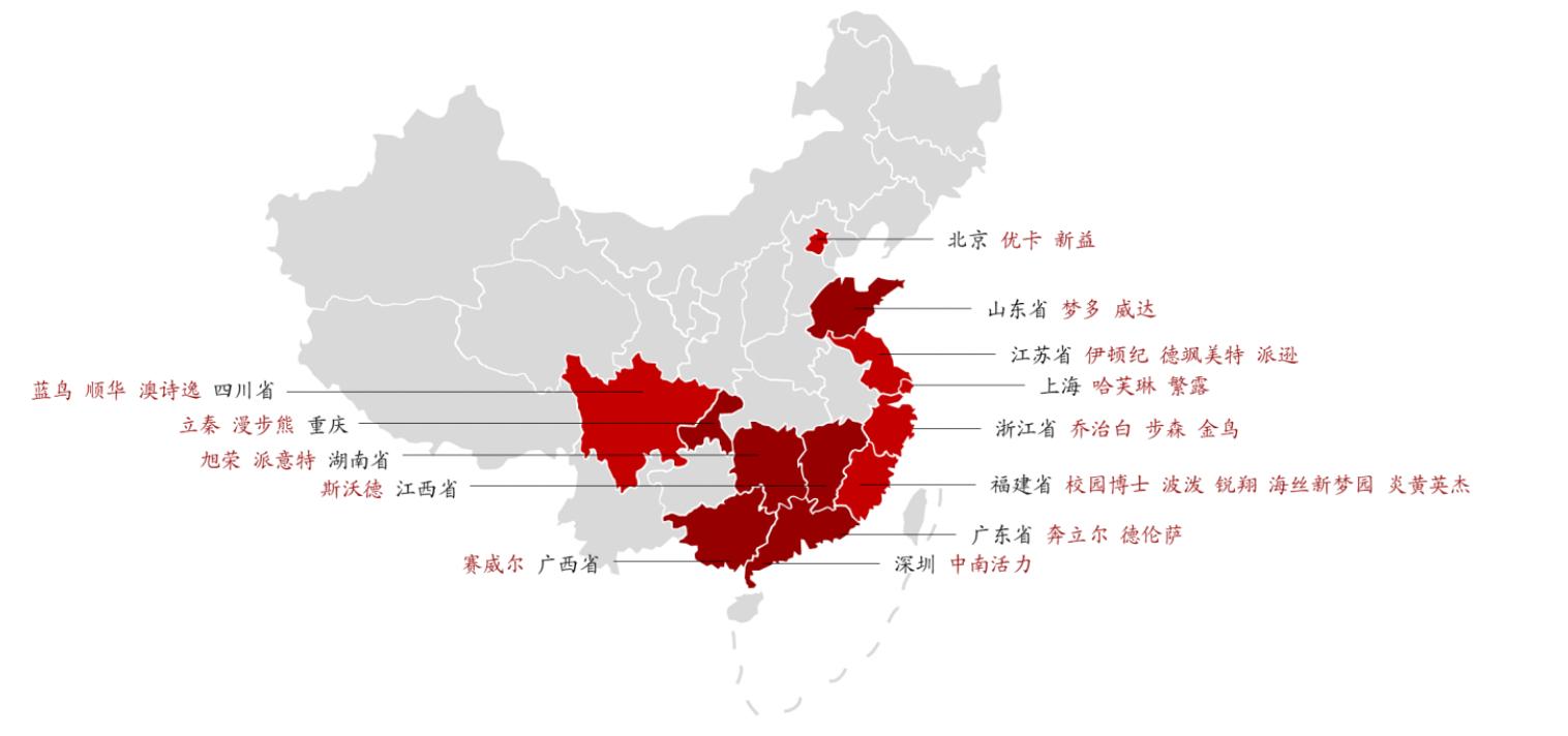 国内基本形成了以乔治白(浙江)、伊顿纪德(江苏)、优卡(北京)、哈芙琳(上海)、梦多(山东)等为代表的校服供应商区域割据、群雄并起的市场格局。