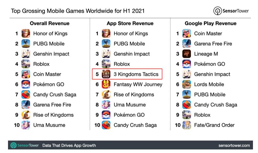 仅从iOS的收入数据来看,《三国志·战略版》在2021年上半年全球收入排行第五,仅次于《王者荣耀》《PUBG Mobile》《原神》和《Roblox》,比《万国觉醒》都高。此前阿里互娱表现比较最好的游戏是代理产品《航海王:燃烧意志》,过亿的峰值月流水表现本来还算可观,对比《三国志·战略版》超过6亿的月流水却明显低了不止一个档次。
