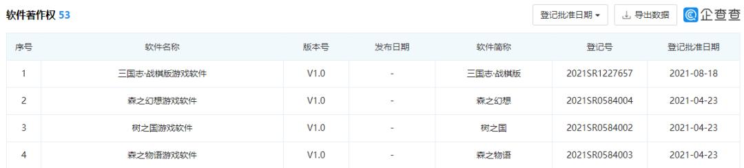 其中可能有两款可能逐渐露出水面。今年登记批准的软件著作权中,包括了《三国志·战棋版》这种可能尝试战棋的新品类,也有《森之幻想/树之国/森之物语》未知具体类型的新品。