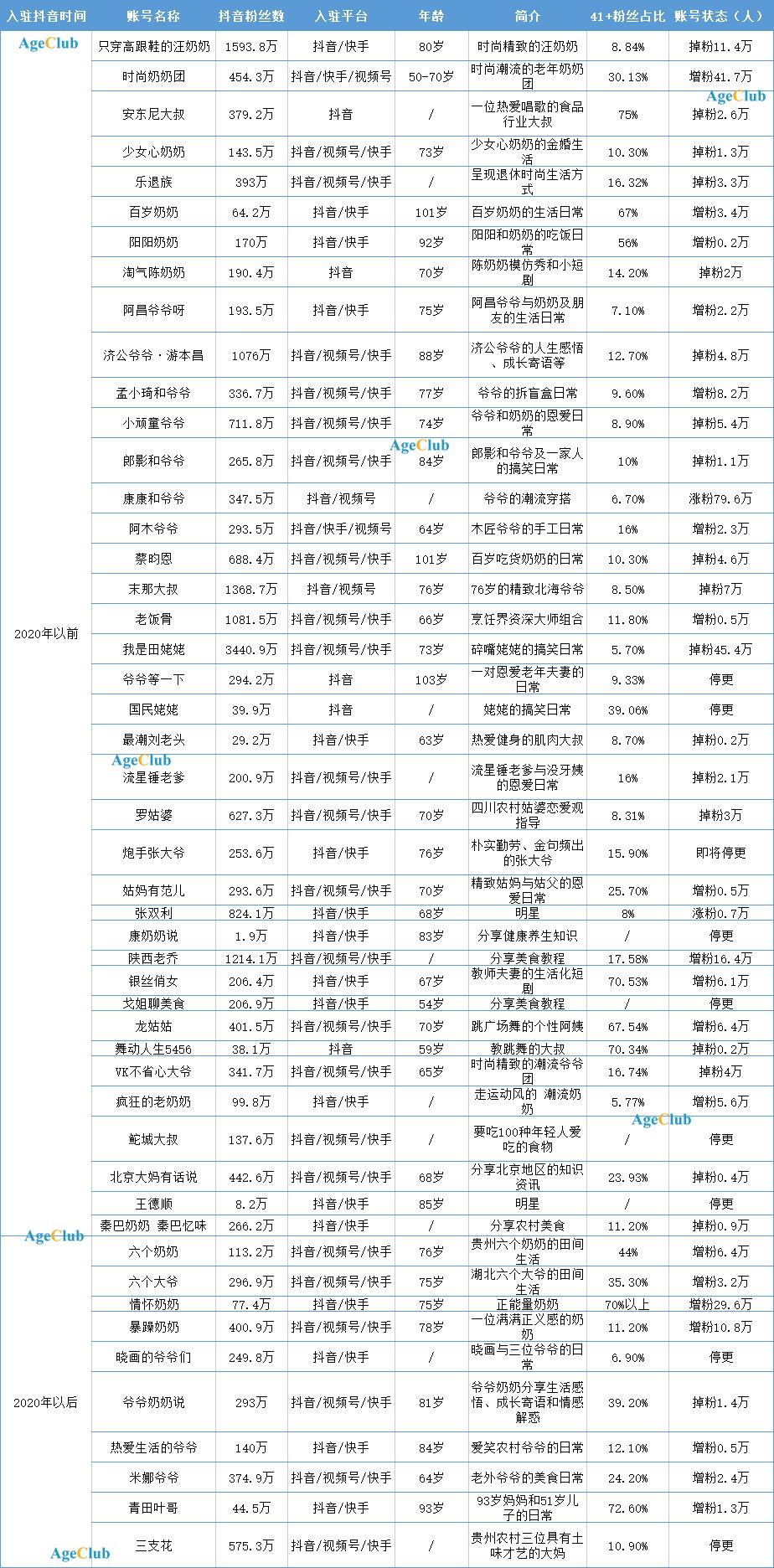 变化的不仅仅是汪奶奶,AgeClub综合研究了抖音50个头部、中部、腰部银发网红,我们发现,经历数年的发展,整个银发网红生态正迎来转折的节点。