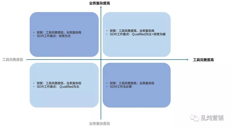 为了便于大家考虑SDR团队在一般意义上的必要性以及在不同企业中的定位,我尝试着根据之前的实际经验,画了一张图表。通俗地讲,一家B2B企业本身产品和业务复杂程度越高、市场体系用于线索培育和商机挖掘的Martech工具完善度越低,SDR团队就越有存在的必要性,且他们要承担的职责越是以商机的挖掘和培育为主;反之,如果业务不复杂,Martech培育工具(MA)又很成熟,理论上就没有费时费力建立SDR团队的必要。