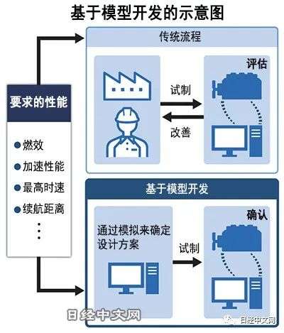 基于模型开发技术通过把所有零部件转化成数据,在计算机上制作出虚拟汽车。在电脑上开动汽车,哪个零部件会发生故障,哪个部分会扰乱空气流动,这些都可以在瞬间导出数据。和实际制作并运行试制车时相比,可以省去每次都要重新制作零部件的工序,能够缩短开发时间和降低成本。