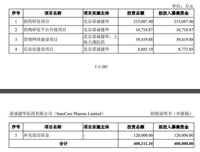 招股书显示,诺诚健华拟凭借此次IPO募集资金40亿元。其中,21.5亿元用于新药研发项目;1.67亿元用于药物研发平台升级项目;3.94亿元用于营销网络建设项目;0.88亿元用于信息化建设项目;剩余12亿元用于补充流动资金。