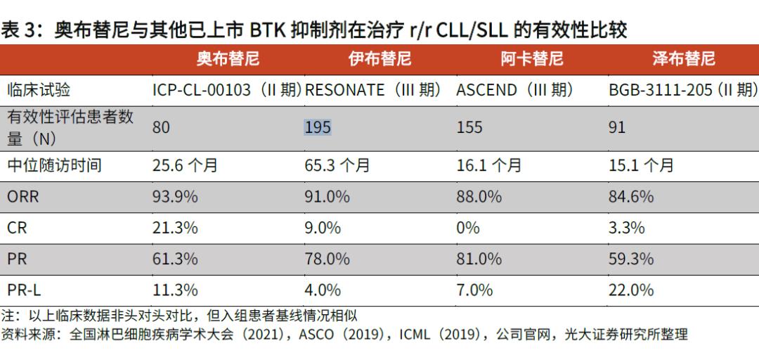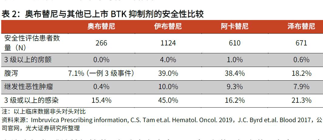 光大证券曾在研报中称,奥布替尼有潜力成为潜在同类最佳BTK抑制剂。和竞品相比,奥布替尼具有更低的不良事件发生率,特别是房颤、腹泻、继发性肿瘤发生率以及3级或以上感染率等均有显著降低;疗效方面,在治疗复发/难治性慢性淋巴细胞白血病(r/r CLL)/小淋巴细胞淋巴瘤(r/r SLL)适应症中,奥布替尼的有效性指标更加出色,在研究者随访时间只有25.6个月的情况下,奥布替尼治疗r/r CLL/SLL的主要终点-总缓解率(ORR)已经达到93.9%,超过随访时间近6年的伊布替尼,其中完全缓解率(CR)达到21.3%,远高于伊布替尼的9.0%,有效性优势非常明显。