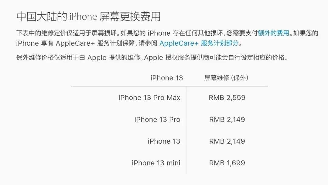 根据苹果官网给出的信息,iPhone 13 Pro Max 的屏幕维修价格为 2559 元,iPhone 13 Pro 和 iPhone 13 为 2149 元,最便宜的 iPhone 13 mini 也需要 1699 元,如果你没有购买 Apple Care+ 服务,那么接下来最好要保护好新 iPhone 的屏幕。