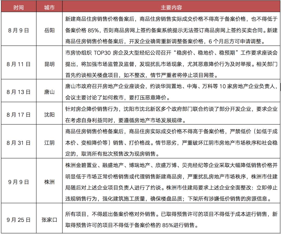 出于稳房价、稳预期的需要,岳阳、昆明等7城相继落地“限跌令”。其中,岳阳、江阴明文规定禁止大幅降价,昆明、唐山、沈阳、株洲采取约谈的方式,禁止房企、中介机构恶意降价、打价格战,扰乱房地产市场秩序。