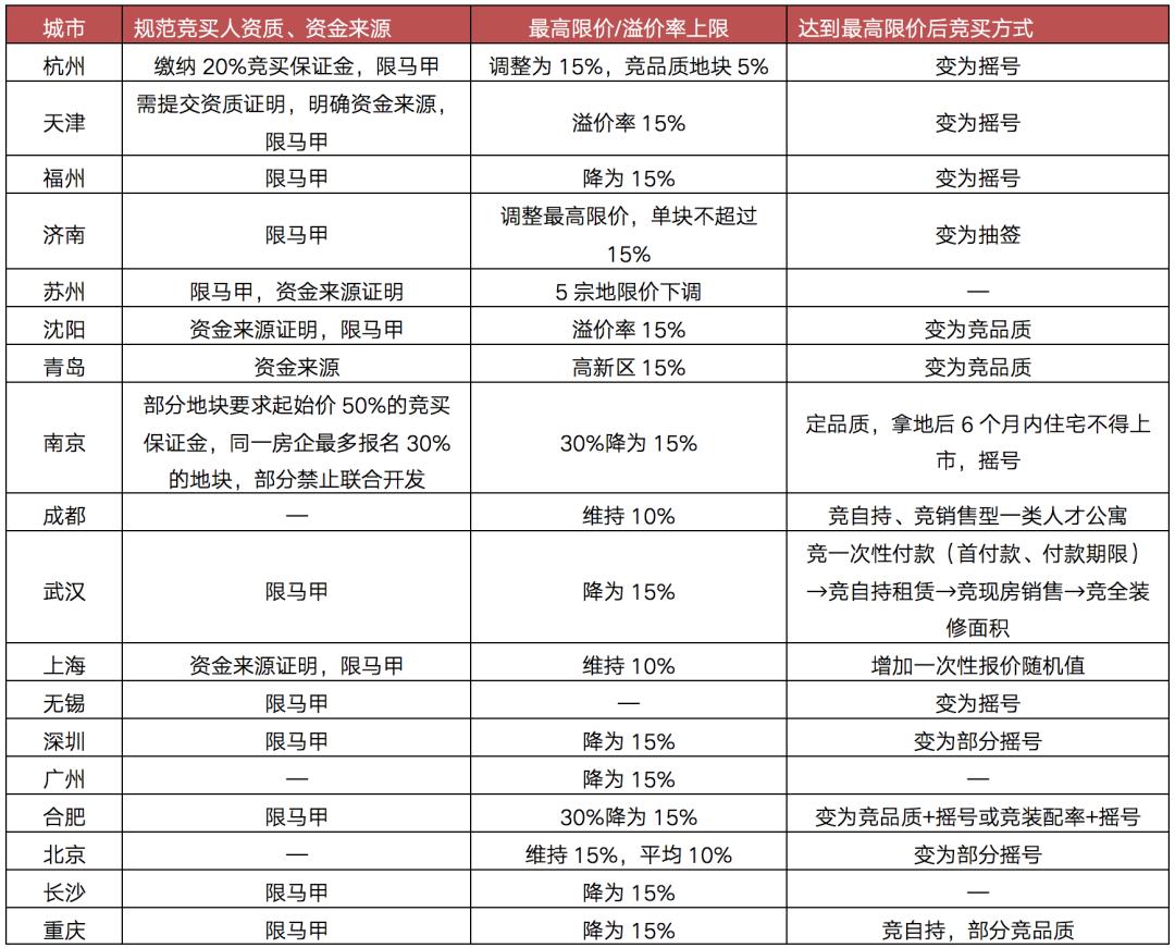 具体来看,在首轮集中供地中,很多城市的结果未及预期,2021年8月10日自然资源部关于集中供地提出了新要求,部分城市纷纷开始调整第二次集中供地规则:单宗土地溢价上限不得超过15%,绝不允许通过提高起拍价格调整溢价率;不得通过调高底价、竞配建等方式抬升实际地价;在达到地价或溢价率的上限时,不得以竞配建等方式增加实际地价,可以通过一次性合理报价、摇号、竞更高更优品质建设方案等方式确定竞得人。