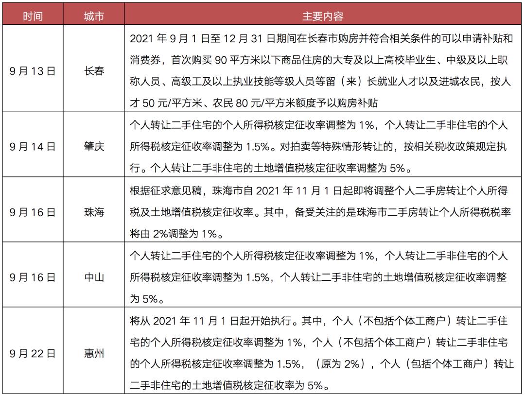 肇庆、珠海、中山、惠州相继下调二手住宅转让个税核定征收率,降低二手房交易成本。具体而言,个人转让二手住宅的个人所得税率由2%调整为1%,二手非住宅个人所得税率、土地增值税率分别调整为1.5%和5%。