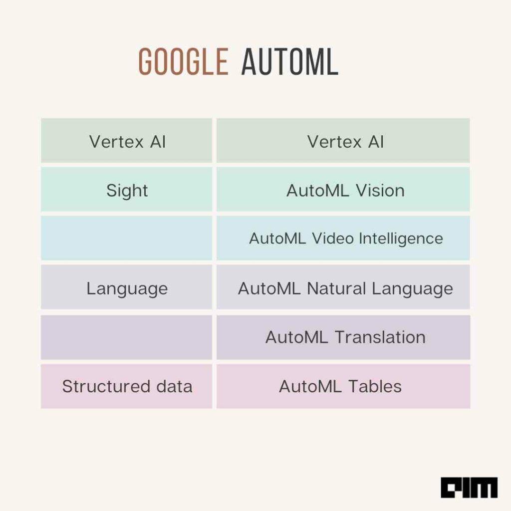 谷歌在该领域的一些最新产品包括Vertex AI、AutoML视频智能、AutoML自然语言、AutoML翻译和AutoML表格。