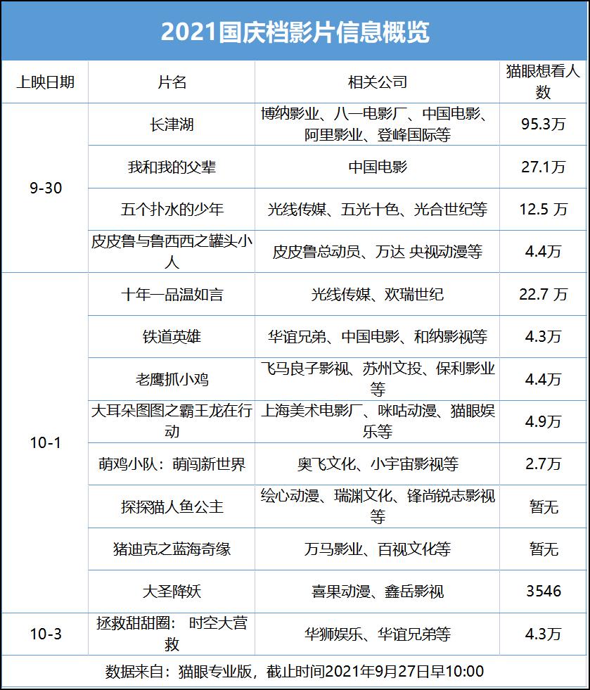国庆档之后,还有圣诞档和贺岁档,不过具体表现还要结合影片供给情况和防疫情况综合考虑,但毫无疑问,国庆档是下半年冲业绩的重头戏。