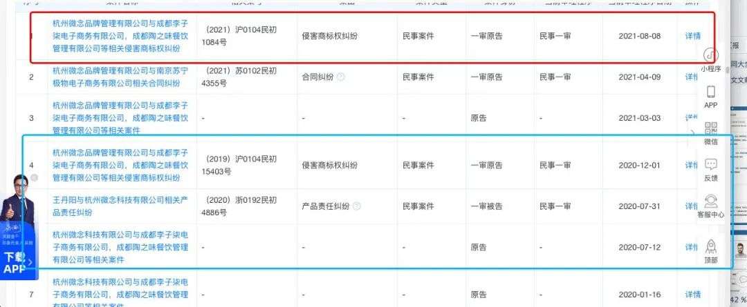 在天眼查上有多则有关侵害商标权的裁判文书,原告皆为杭州微念。这似乎也意味着“李子柒”这个商标权,归属于杭州微念。
