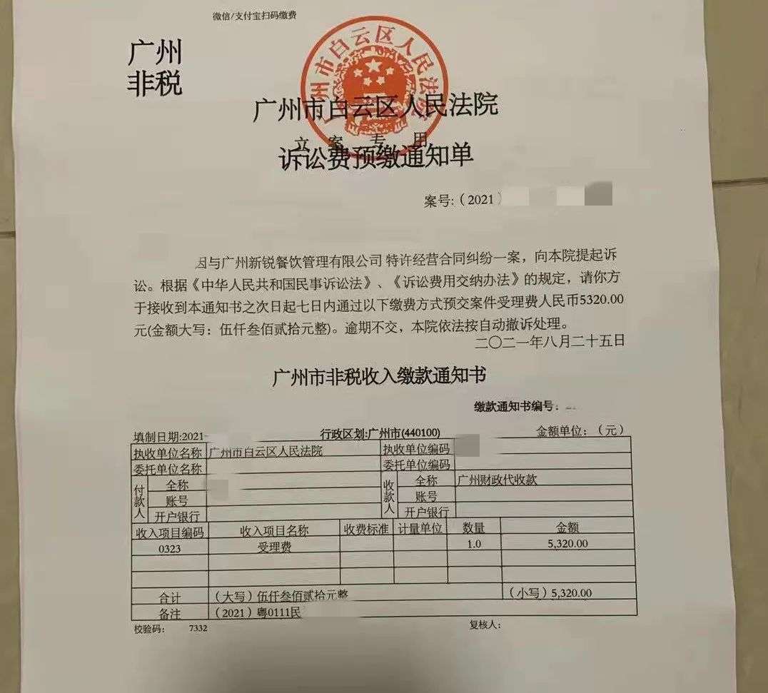 △加盟商起诉一次,要缴5320元案件受理费,图片来源:受访者供图