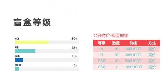 这批盲盒共分为4个等级:N级、R级、SR级和SSR级,分两个阶段进行售卖。第一阶段为9月15日至9月22日,在此期间,盲盒会于每日14时上架并解锁75个,共计600个;第二阶段为9月23日至9月26日,共上架了369个盲盒。这批969个盲盒的统一售价为50 USDT。其余31个盲盒则以公开竞价形式进行出售。