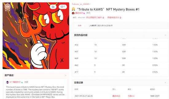 据Gate.io NFT魔盒最新数据显示,致敬KAWS系列盲盒上线后,二级市场的最高成交价短时间内便达到了1888 USDT,溢价3676%。致敬KAWS系列盲盒也成为了Gate.io NFT魔盒热门盲盒第一。截至目前,致敬KAWS系列盲盒在二级市场的价格还在持续飙升。