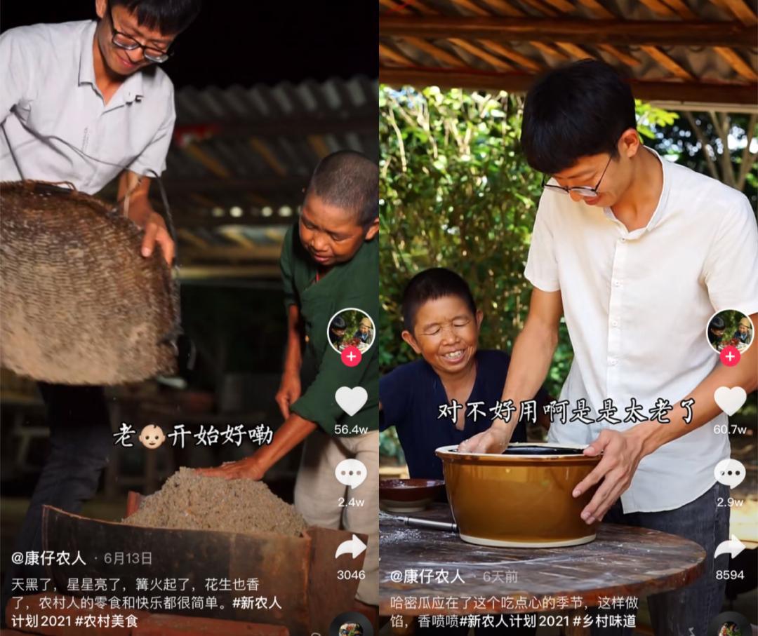 “康仔农人”在过去的3个月里涨粉超533万 ,这是小伙子康仔、50岁“矮小症”邻居(被称为“老小孩”)的组合。细心的观众发现,老小孩一开始在视频里还非常腼腆,后来笑容逐渐变多。