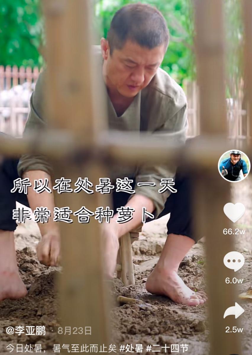 李亚鹏试图在视频中展现中国传统文化与农耕劳作的生活方式。比如一条“处暑”主题的视频中,他提及“处暑适合种萝卜,因为萝卜喜欢冷的天气”,同时,赤着脚,在沙地里掘了一铁锹土,撒了一粒种子,却被细心的网友指出,连续擦汗四五次,“太刻意了,感觉不自然”。