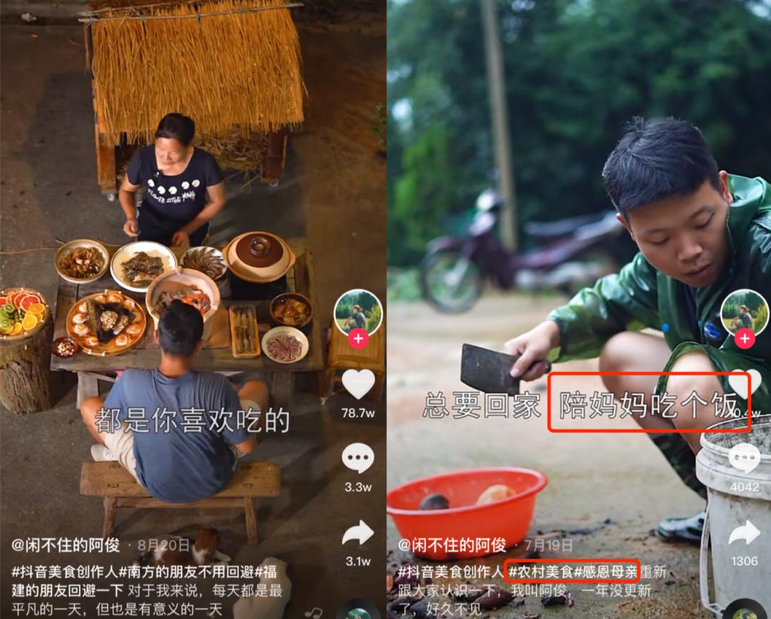 几乎是在同一时间,另一位“男版李子柒”也走入了大众视野。他是抖音达人“闲不住的阿俊”,从7月下旬开始更新视频,视频标签多是“农村美食”“感恩母亲”。