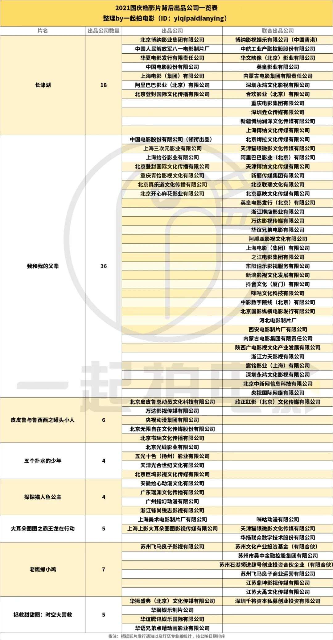 相比而言,2019年和2020年都突破了100家,去年更是高达140多家。当然,这与档期内上映的影片数量也有很大的关系。比如,2019年的“献礼三巨头”,每部影片背后都有20家以上的出品方。