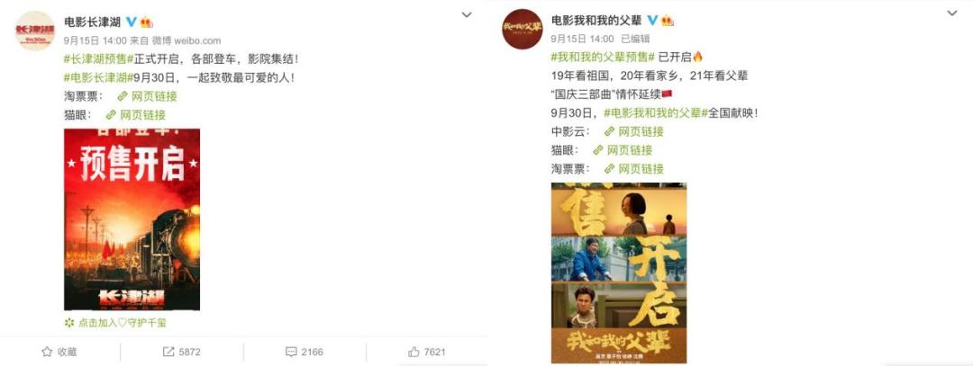 一般来说,预售开启的时候便意味着国庆档大幕的正式拉开,这个时间越早,无疑会对整体大盘的促进作用更明显。比如像2019年,国庆档三部影片提前三周开启预售,到国庆档之前均实现预售破亿的成绩。