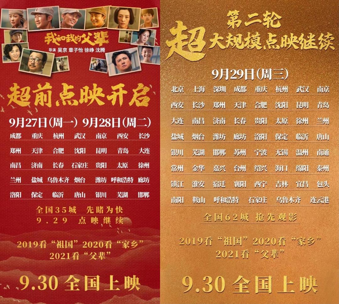 《我和我的父辈》则进行了更为积极的超前点映,于27-29日共开启两轮点映。 其中,27/28日两天为第一轮超前点映,包括成都、重庆、杭州、武汉、南京等在内的35个一、二线城市;29号则在此基础上开启第二轮规模更大的点映,辐射至全国62城,包括北京、上海、深圳等超一线城市在内,以确保优质口碑的进一步扩散。