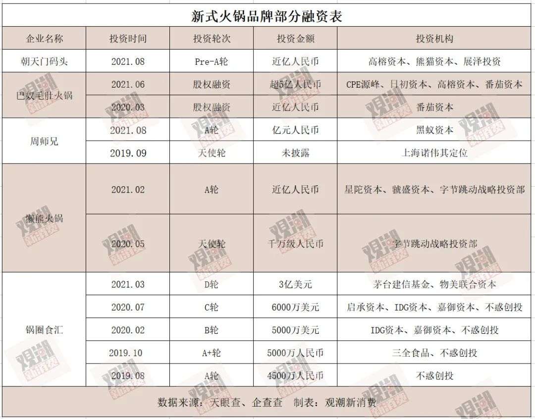 2020年以来,火锅店、火锅食材超市、自热火锅和火锅底料等成为热门赛道。观潮新消费(ID:TideSight)据公开数据不完全整理,近半年来,近30亿元涌入火锅行业,火锅行业上下游企业接连融资,背后不乏IDG资本、字节跳动、高融资本、黒蚁资本等专注消费的一线投资机构。