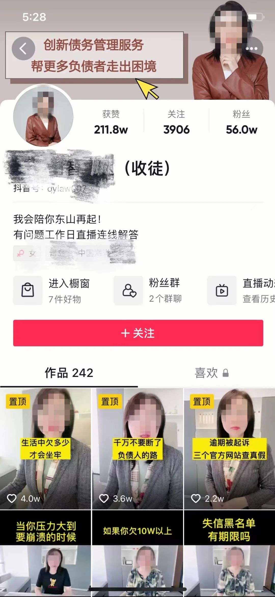 有的账号会在主页直接挂出联系方式,有的则是通过私信对接,或者组建群组,或通过直播分享。到这里,获客目标基本完成,客户进入到下一个环节——一对一联系并商议债务解决方案。