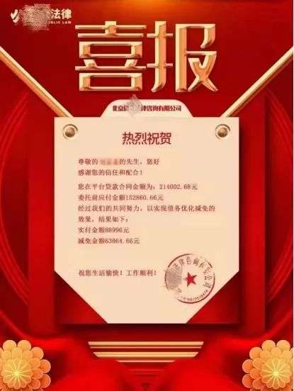 一些代理投诉或委托协商的成功案例被律所或中介反复宣传,甚至做成「喜报」大肆传播。减免金额被放在了核心的位置,可以轻易地刺激到借款人的神经,人性的黑洞被瞬间放大,「违约」似乎并不是一件可耻的事。