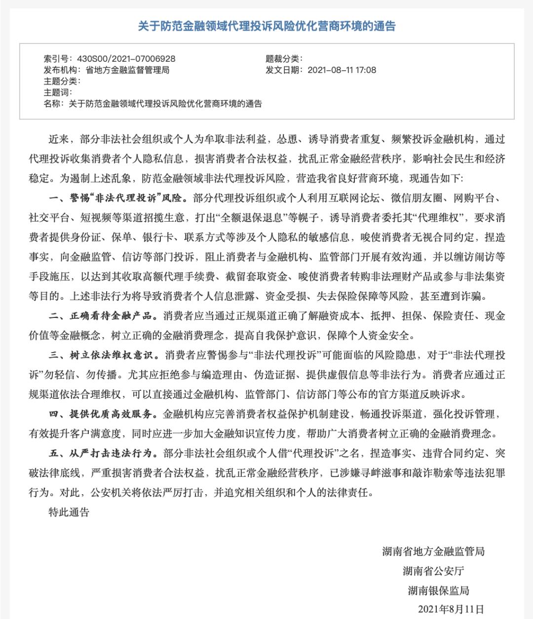 不仅如此,今年以来,包括北京、湖南、辽宁、广东等多个地方金融监管部门联合司法机关发布了「防范金融领域代理投诉风险」的通知,针对反催收乱象提出了警示: