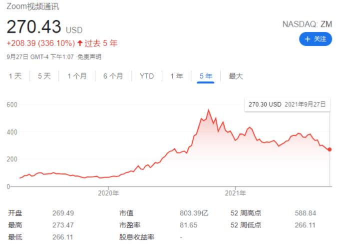 受新冠疫情影响, Zoom已成为世界上最知名的品牌之一。 2020年1月至2021年1月,由于新用户的大量涌入, Zoom的年收入飙升了326% 。今年上半年,其股价在过去一年中飙升了368% ,尽管近期有所回落,其市值从250亿美元左右曾增至近1000亿美元。