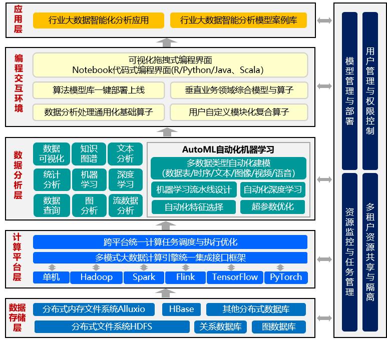 平台底层支持Alluxio、HDFS、HBase、Hive、关系型数据库、分布式数据库、图数据库等存储系统,上层通过跨平台统一计算任务调度实现Scikit-learn、Spark、Flink、Tensorflow、Pytorch等主流计算平台的混合调度,从而支持数据查询分析、机器学习、深度学习、图计算等数据分析任务以及AutoML自动化AI建模和调优。基于计算流图的可视化拖拽式编程,可以快速构建业务模型并上线部署,从而服务于各行业的大数据分析和应用,为大数据分析建模降本提效,加速产业数字化应用落地。